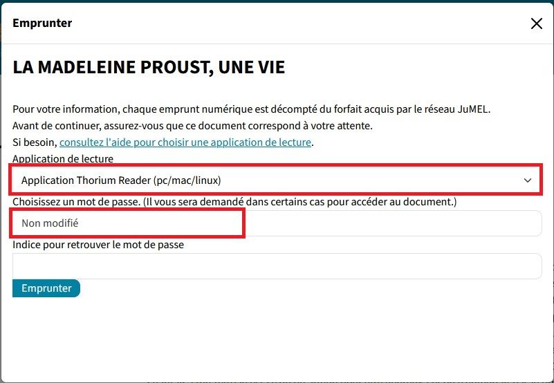 - Sur Thorium Reader, les livres s'ouvrent avec un mot de passe (celui que vous choisissez au moment du téléchargement). C'est le système de verrou LCP. Compatible Windows, MacOS et Linux, Thorium Reader est aussi adapté au public ayant des difficultés de lecture, car il propose de nombreuses possibilités d'affichage et une synthèse vocale.